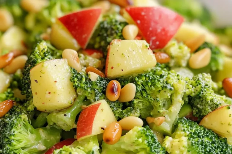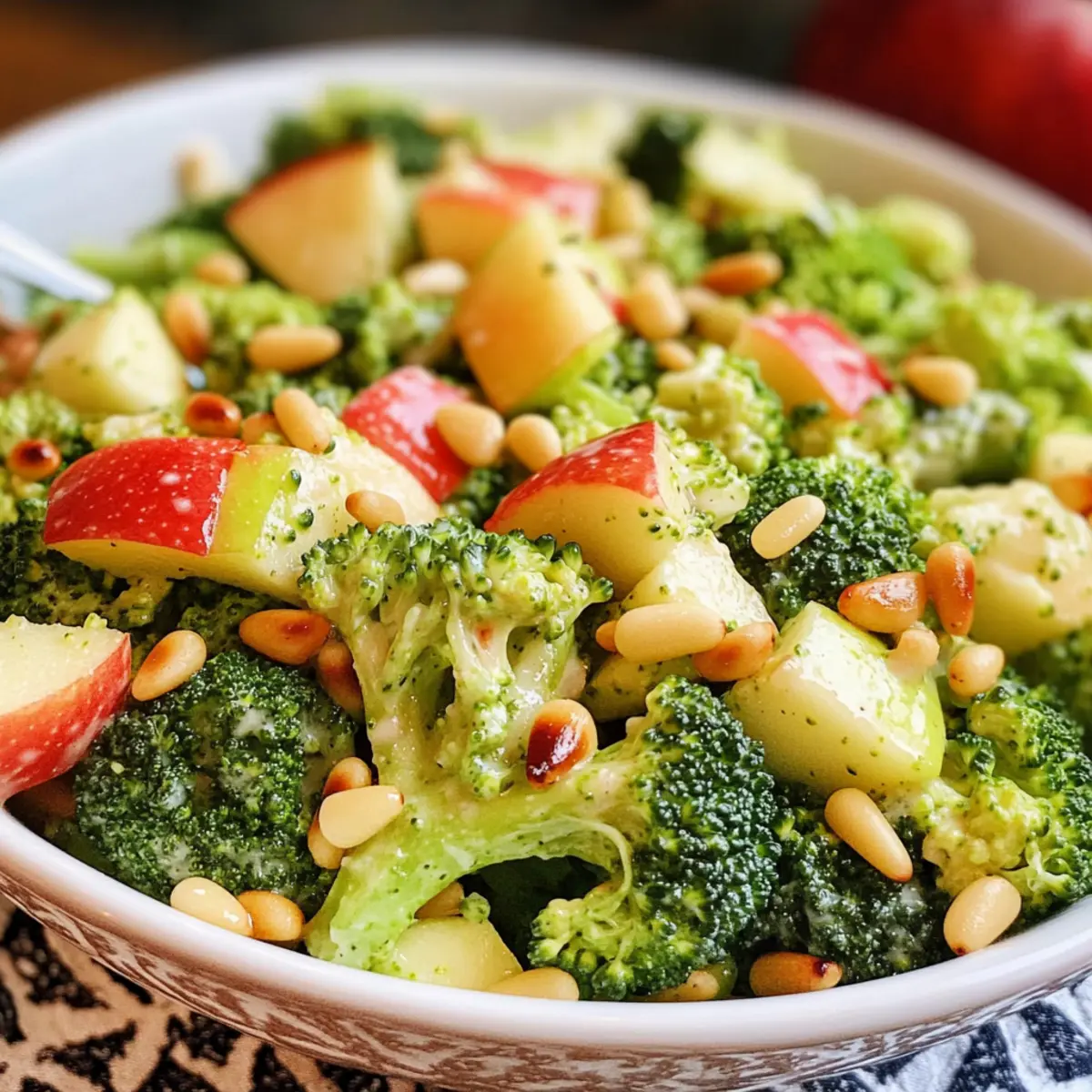 Dieser Brokkolisalat kombiniert knackigen Brokkoli, süßen Apfel und nussige Pinienkerne für ein gesundes und köstliches Gericht.