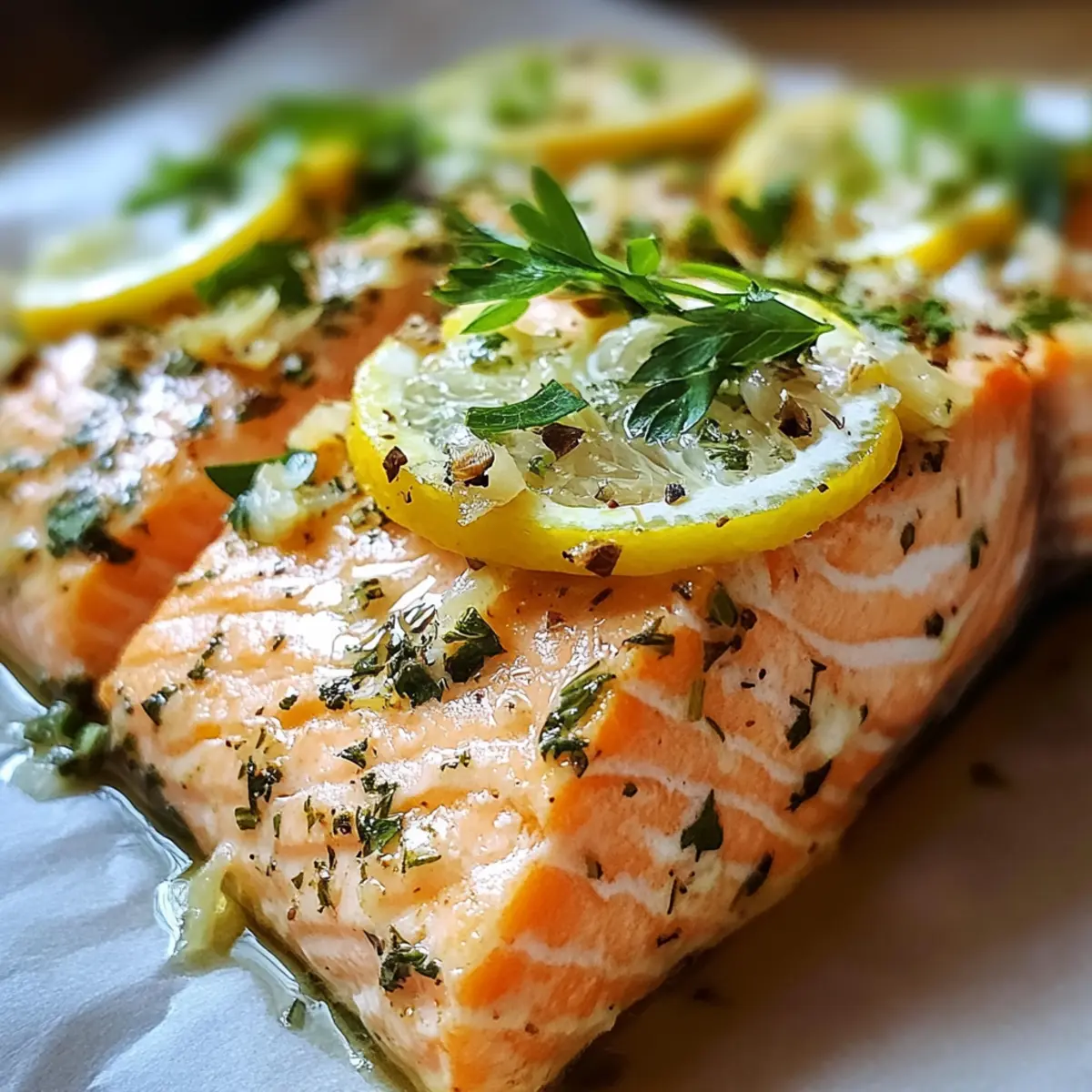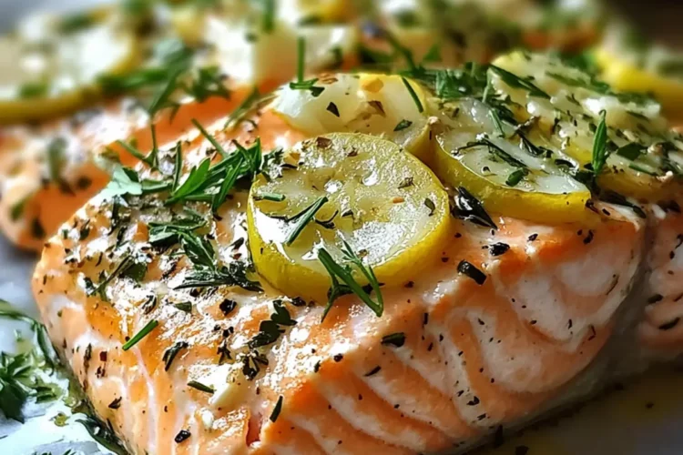 - Gieße die Brühe vorsichtig über die Lachsfilets.