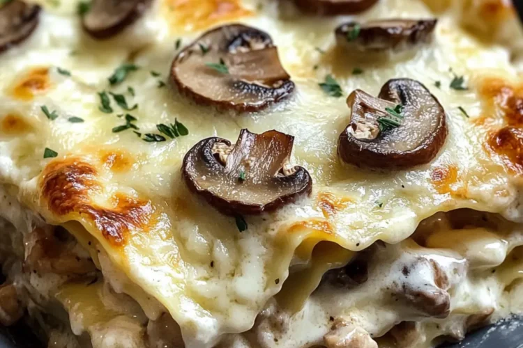 Gönn dir diese köstliche Käse-Pilz-Hühnchen-Alfredo-Lasagne und erlebe ein Fest der Aromen!
