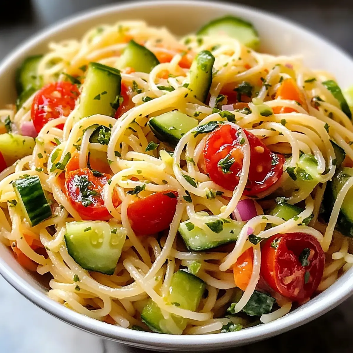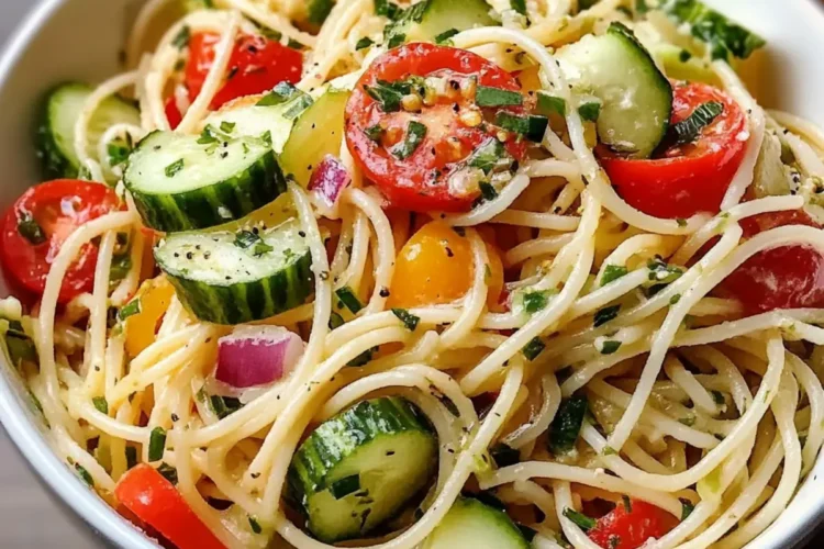 Kalifornischer Spaghetti-Salat mit frischem Gemüse: Ein einfacher, gesunder und bunter Genuss für jeden Anlass.