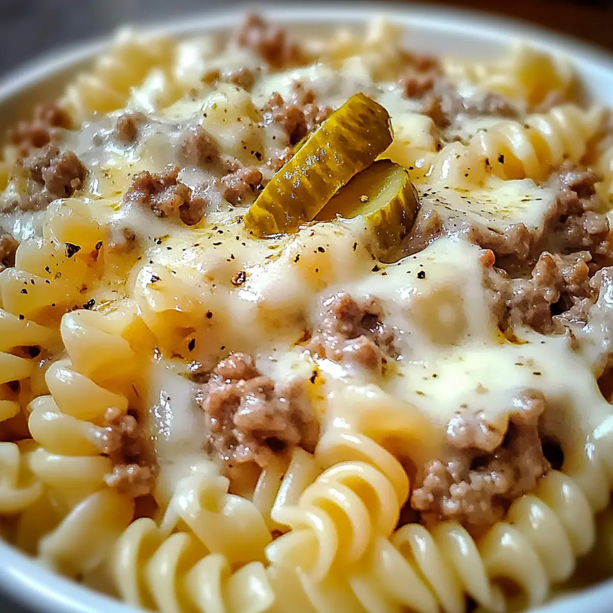 - Serviere die Käseburger-Alfredo-Nudeln heiß in tiefen Schalen. Garniere nach Belieben mit Käse, Dillgurken und optionalen Toppings.
