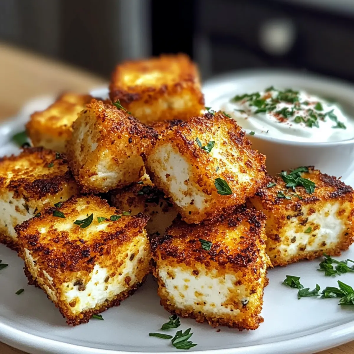 - Den knusprigen Feta warm servieren, begleitet von der Joghurtsauce.