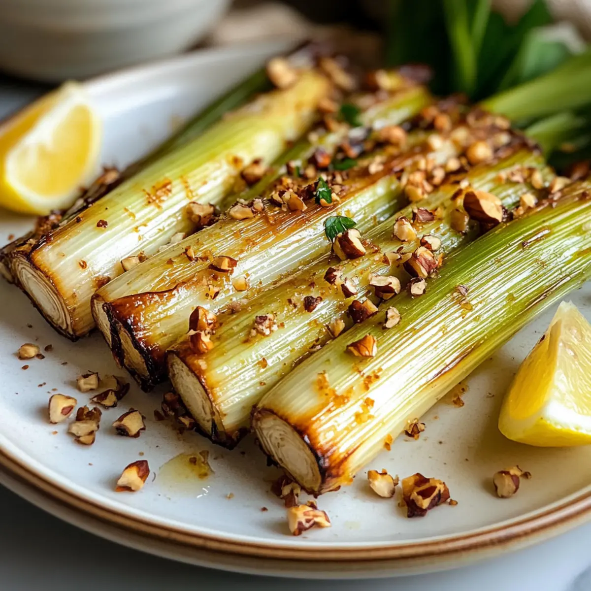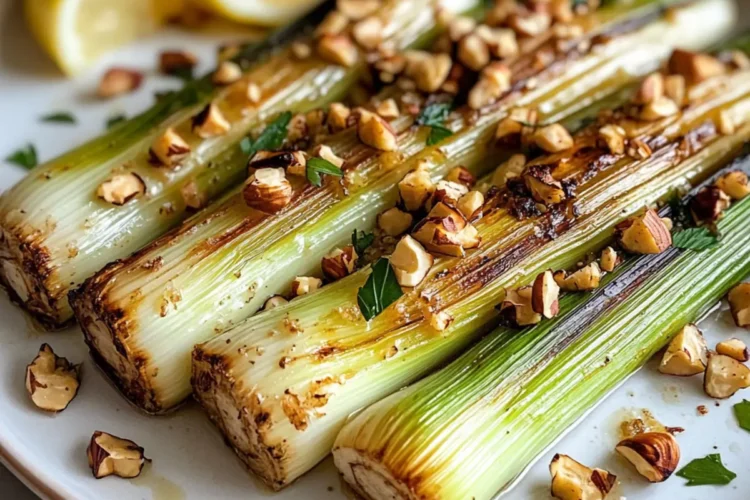 - Richte den knusprigen Lauch auf einem Teller an und bestreue ihn mit den gerösteten Haselnüssen.