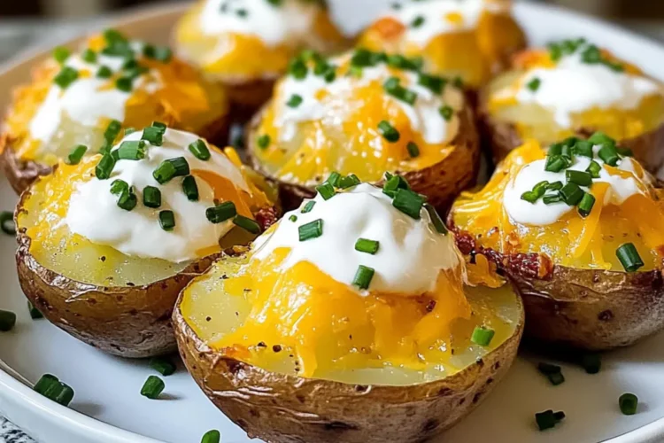 - Toppe die Kartoffeln mit Sauerrahm und Schnittlauch und serviere sie warm.