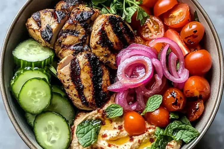 Dieser Mediterraner Hähnchenteller mit Hummus Rezept ist perfekt für die Vorbereitung, um wertvolle Zeit während geschäftiger Wochentage zu sparen! Du kannst das Hähnchen bis 24 Stunden im Voraus marinieren, um die Aromen optimal einziehen zu lassen; lagere es einfach in einem luftdichten Behälter im Kühlschrank. Ebenso lassen sich die roten Zwiebeln bereits 3 Tage vorher einlegen, um ihren Geschmack zu intensivieren. Wenn es Zeit zum Servieren ist, erhitze das gegrillte Hähnchen kurz in einer Pfanne, um die Knusprigkeit wiederherzustellen, und richte alles in einer Schüssel an. So erhältst du mit minimalem Aufwand eine köstliche, frisch zubereitete Mahlzeit, die nicht nur einfach, sondern auch genauso schmackhaft ist!