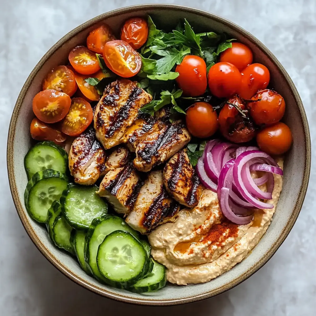 - In einer großen Schüssel eine großzügige Portion Hummus verteilen, gefolgt von den geschnittenen Hähnchenstücken, Cherrytomaten und Gurkenscheiben.