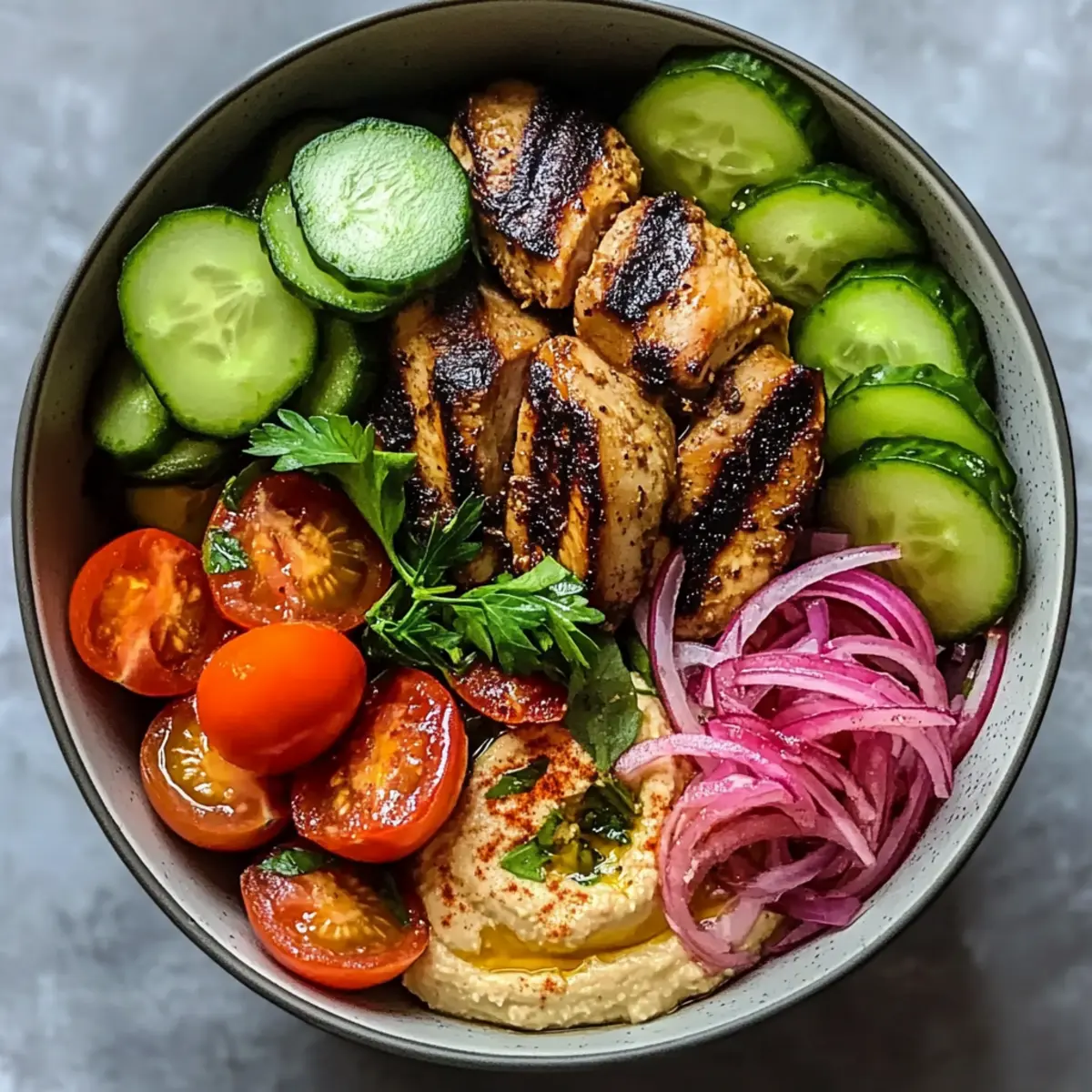 In einer großen Schüssel eine großzügige Portion Hummus verteilen, gefolgt von den geschnittenen Hähnchenstücken, Cherrytomaten und Gurkenscheiben. Die eingelegten Zwiebeln gleichmäßig darauflegen und mit frischen Kräutern garnieren, um dem Gericht eine frische Note zu verleihen. Ein Spritzer Olivenöl oder Zitronensaft kann ebenfalls hinzugefügt werden, um die Aromen zu intensivieren.