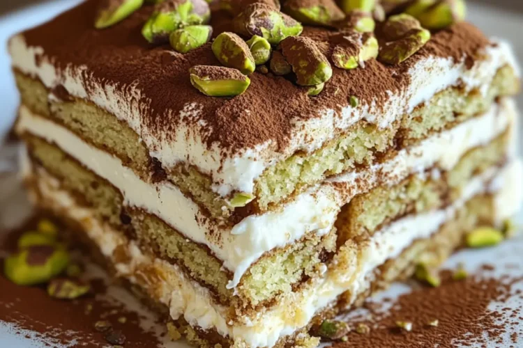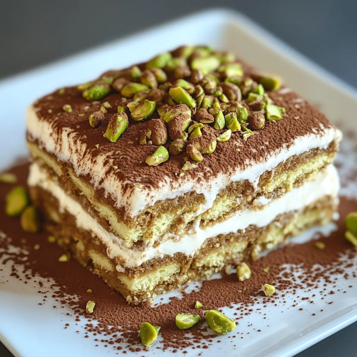 Einzigartiger Genuss: Dieses Tiramisu begeistert mit einer unwiderstehlichen Kombination aus Mascarpone und gerösteten Pistazien, die ein nussiges Aroma entfalten.