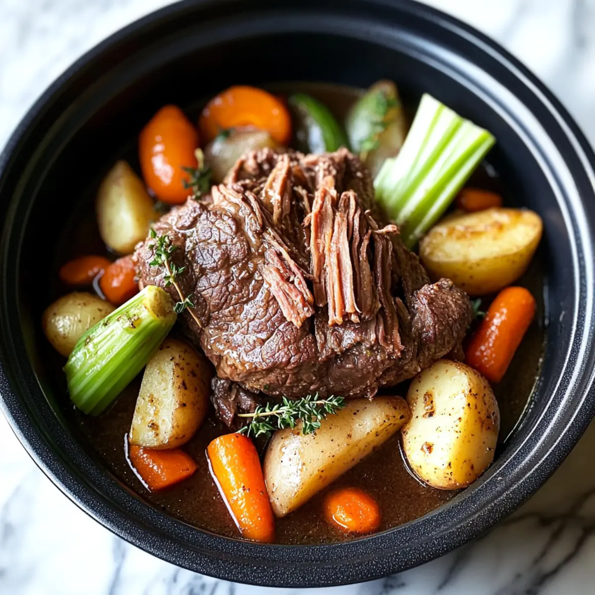 Lege die Kartoffeln, Karotten, Sellerie, Zwiebel, Knoblauch, Thymian und das Lorbeerblatt in den 6-Liter-Slow Cooker. Gieße die vorbereitete Rinderbrühe-Mischung über die Gemüse und würze sie nach Geschmack mit Salz und Pfeffer. Setze das angebratene Fleisch darauf und achte darauf, dass alles gut verteilt ist.