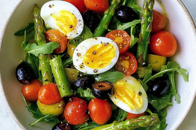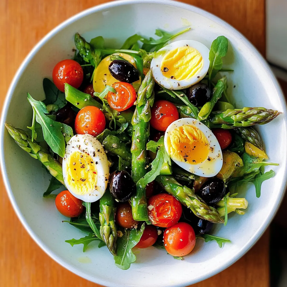 Frische Aromen: Dieser Spargelsalat kombiniert knackigen, frischen Spargel mit süßen Kirschtomaten und würzigem Rucola – ein echter Genuss für die Sinne.