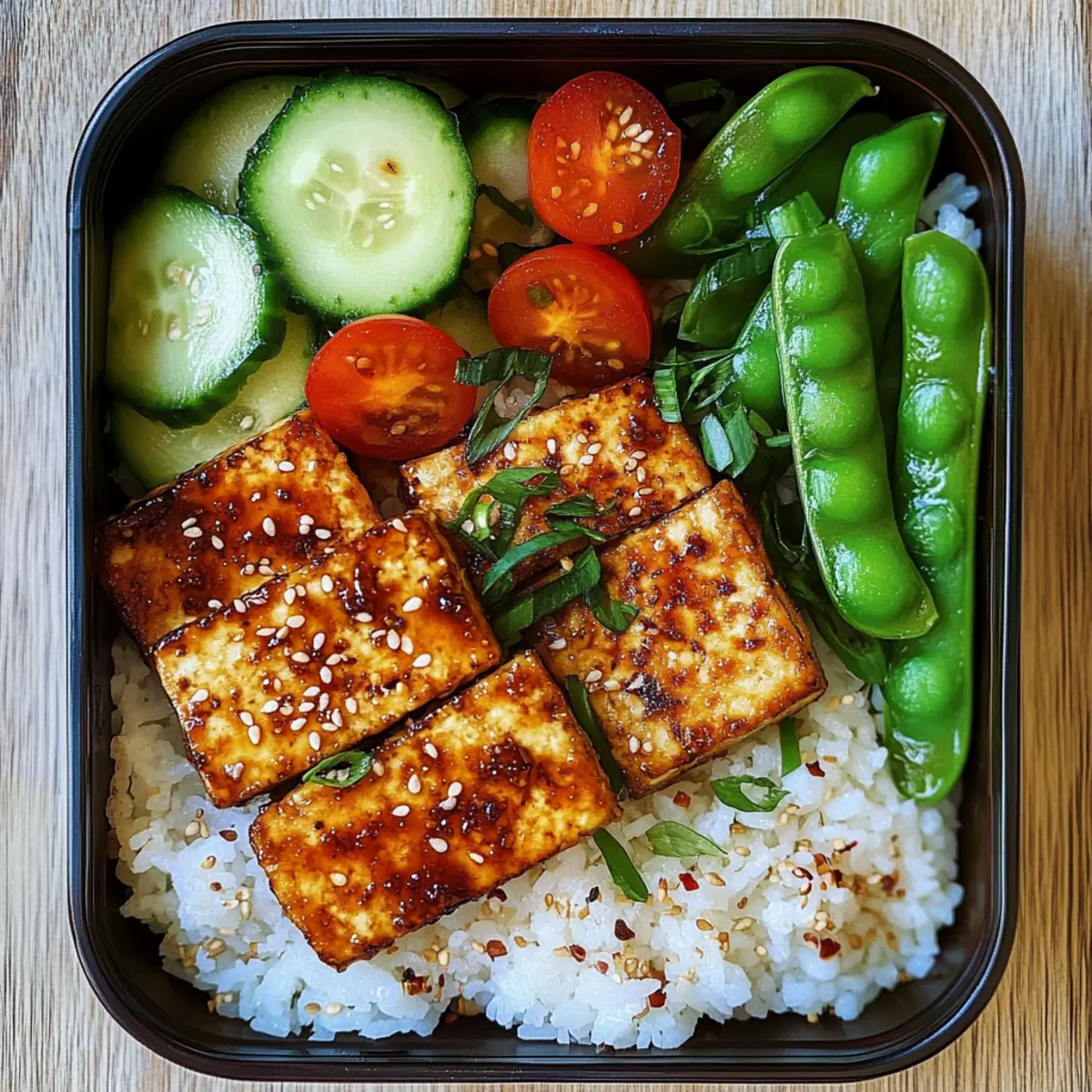 Schichte den fluffigen Reis in die Bento-Box, gefolgt von den Tofustücken, die mit der Teriyaki-Sauce glasiert sind. Streue Sesam darüber, um zusätzlichen Geschmack zu verleihen. Füge die marinierten Gurken, die blanchierten Zuckerschoten und die halbierten Kirschtomaten hinzu, um die Box schön zu dekorieren und mehr Frische zu bieten.