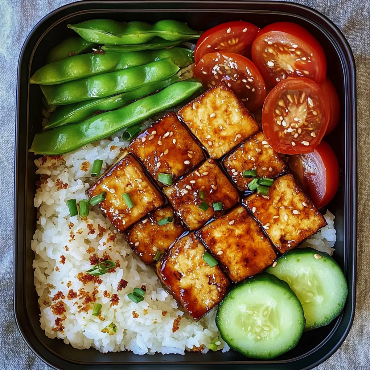 Diese lecker gefüllte Tofu Teriyaki Bento-Box wird dich mit ihrer Vielfalt an Texturen und Geschmäckern begeistern—ein echtes Fest für die Sinne!